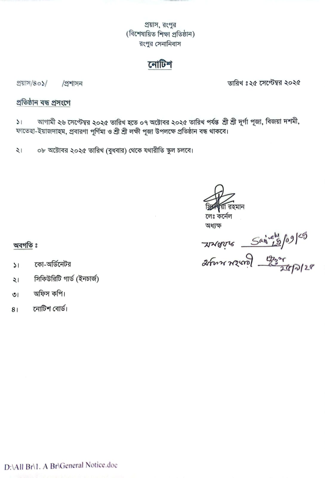 শ্রী শ্রী দুর্গা পূজা, বিজয় দশমী, ফাতেহা ইয়াজদাহাম, প্রবরুণ পূর্ণিমা এবং শ্রী শ্রী লক্ষ্মী পূজা উপলক্ষে প্রতিষ্ঠান বন্ধ থাকবে।